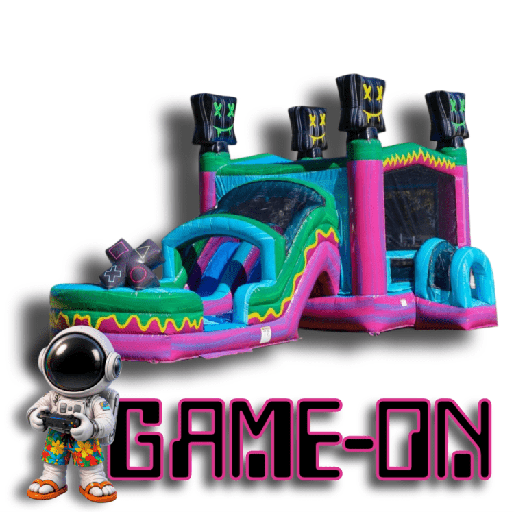 Game On is one of our premiere In Slide Outs (Combos) which features an exciting Dual Lane slide. It is packed with plenty of features for playtime! Guests can enjoy a dual lane slide, bounce house, climb wall, basketball hoop, tunnel, and obstacles all on one amazing inflatable! This inflatable is perfect for parties, events, or just good old daily fun!