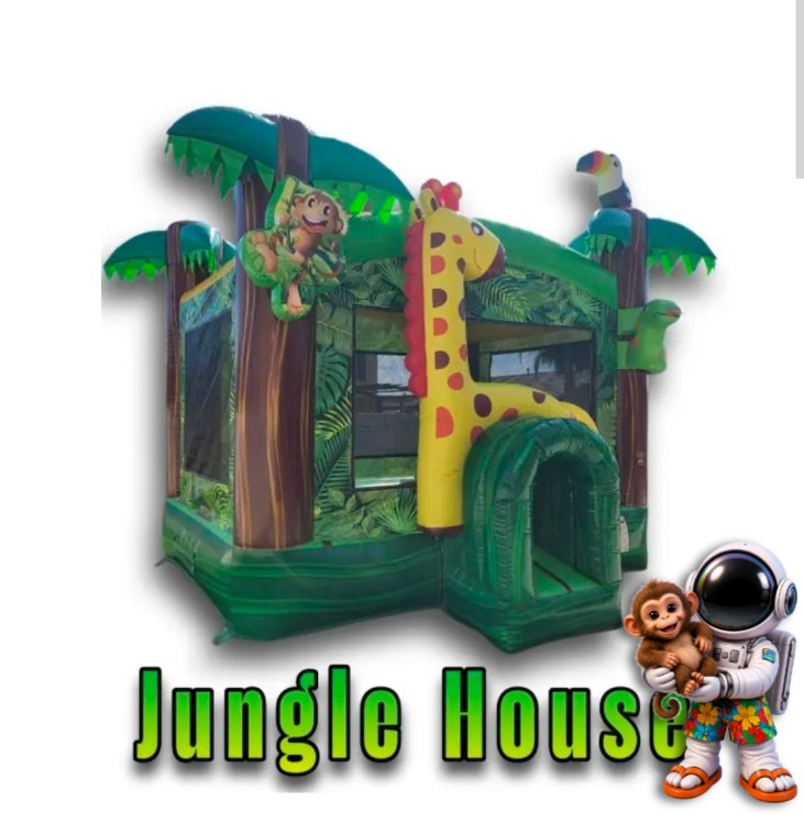 Step into a wild adventure with the Jungle House Bounce House! This inflatable masterpiece transforms any event into a thrilling safari, complete with vibrant jungle-themed designs. Kids can jump, bounce, and explore to their hearts' content, all while immersed in a world of leaping lemurs and towering trees. Perfect for birthday parties, school events, or just a weekend of fun – it's guaranteed to bring smiles and countless memories.