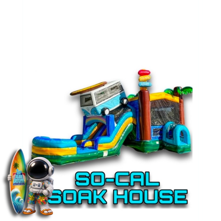 Dive into an ocean of fun with the So-Cal Soak House! Imagine an inflatable paradise where jets of water keep you cool while you bounce and play. Perfect for hot summer days, this rental will turn any backyard into a beach party, making it the ultimate splash-tastic experience for kids and teens alike!