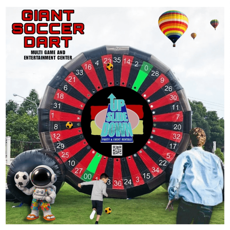 The Giant Soccer Dart is the ultimate mash-up of three classic games. It's a colossal inflatable combining the excitement of soccer and the strategic aim of roulette styled dart throwing. The side includes a bean bag styled tic tac toe and drinking game. Imagine a towering, velcroed dartboard where you kick specially designed soccer balls to score big. Perfect for outdoor parties or events, this lively rental adds a giant-sized dimension to friendly competition. Safe for all ages, it's a goal you'll want to hit repeatedly, honing your aim while having a blast.
